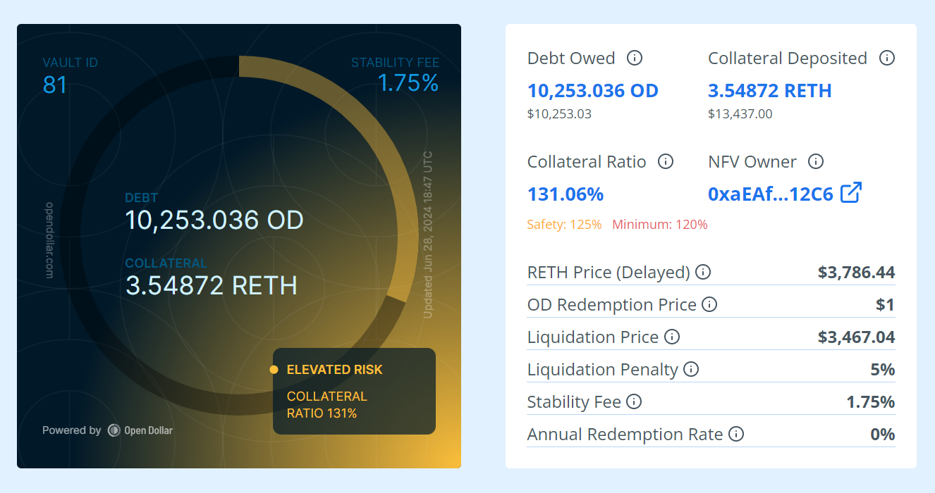 - Dynamic image and metadata display: NFV images show the current status, state, pledge and debt of the vault with time updates, and are displayed entirely on the blockchain.